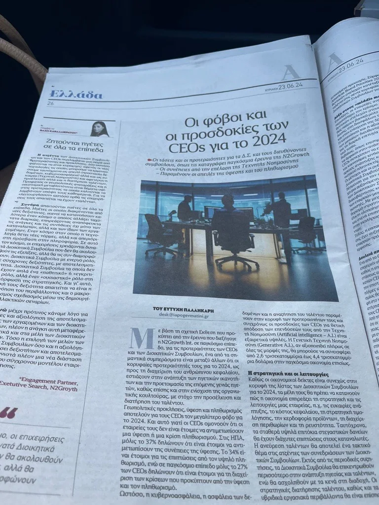 «Η ατζέντα των Διοικητικών Συμβουλίων και των CEO’s περιλαμβάνει μια σειρά από προτεραιότητες και προκλήσεις. Δύο ωστόσο φαίνονται να είναι κυρίαρχες: αφενός οι νέες τεχνολογίες τις οποίες μπορούμε να ερμηνεύσουμε ταυτόχρονα ως απειλή (προστασία δεδομένων, Κυβερνοασφάλεια) αλλά και ως ευκαιρία (τεχνητή νοημοσύνη) και αφετέρου η προέλκυση αλλά και η διατήρηση ταλέντων. Προφανώς οι γεωπολιτικές αναταράξεις και η οικονομική μεταβλητότητα είναι θέματα υψίστης προτεραιότητας τα οποία καλούνται να λαμβάνουν υπόψη τους καθημερινά. Για να «λειτουργήσουν» ωστόσο ορθά τις επιχειρήσεις τους απαιτείται να έχουν «ταλέντα». Συνάμα απαιτούνται ηγέτες σε όλα τα επίπεδα. Ηγέτες οι οποίοι διακρίνονται από νέες δεξιότητες, ικανοί να κατανοήσουν καλύτερα έναν κόσμο ο οποίος αλλάζει ταχύτατα διαρκώς, επηρεάζοντας αναπόφευκτα τις ανάγκες και τις συνήθειες όχι μόνο των καταναλωτών αλλά και των ίδιων των εργαζομένων. Έναν κόσμο στον οποίο η τεχνολογία θέτει νέες νόρμες – αλλά και απεριόριστη πρόσβαση στην πληροφορία. Σε αυτό τον κόσμο, οι επιχειρήσεις χρειάζονται δυνατά διοικητικά συμβούλια που δεν θα ακολουθούν τις εξελίξεις, αλλά θα τις συν- διαμορφώνουν. Διοικητικά Συμβούλια με ενεργό ρόλο, με σύγχρονες δεξιότητες, με αποτελεσματικότητα. Διοικητικά Συμβούλια τα οποία δεν θα έχουν απλά ένα «παθητικό» ή «εγκριτικό» ρόλο, αλλά έναν «ουσιαστικό» ρόλο στη διαμόρφωση της στρατηγικής. Και για αυτό, βασική τους δεξιότητα απαιτείται να είναι η κατανόηση του περιβάλλοντος και ο μακροπρόθεσμος σχεδιασμός μέσω της δημιουργίας εναλλακτικών σεναρίων. Κι ενώ μέχρι πρώτιστος κάναμε λόγο για δεξιότητες και αξιολόγηση της αποτελεσματικότητας των εργαζόμενων και των διοικητικών ομάδων, πλέον η ανάγκη αυτή μεταφέρεται επιτακτικά και στα μέλη των Διοικητικών Συμβουλίων. Τόσο η επιλογή των μελών των Διοικητικών Συμβουλίων όσο και η αξιολόγησή αυτών βάσει δεξιοτήτων και αποτελεσματικότητας, συνιστά πλέον μια νέα διάσταση στο πλαίσιο του σύγχρονου μοντέλου εταιρικής διακυβέρνησης», σχολίασε χαρακτηριστικά ηΒασιλική Καβαλλιεράτου, Engagement Partner τηςN2Growthπάνω στη σχετική έκθεση της N2Growth που δημοσιεύτηκε στο Powergame.gr και στην Απογευματινή της Κυριακής, σχετικά με τους φόβους και τις προσδοκίες των CEOs για το 2024.